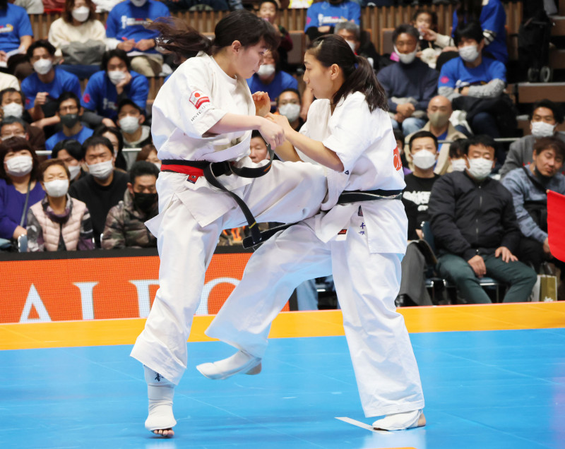 鈴木(左)がヒザ蹴り、中段蹴りで久保田を追い詰める