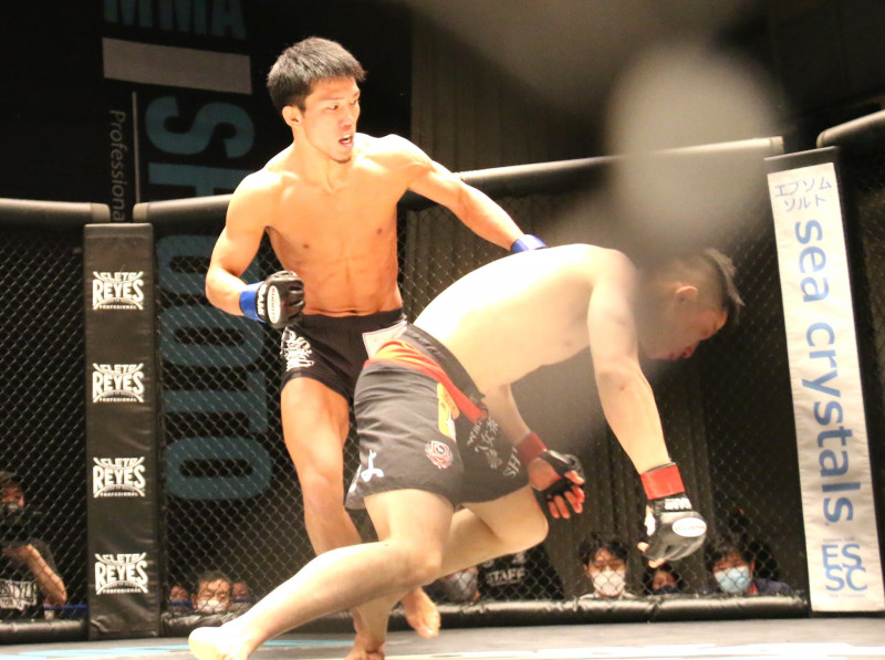 齋藤奨司(左)は野尻定由(右)を右フックでKO