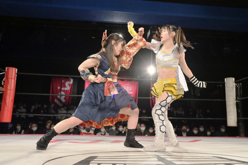 上段受けで攻撃をガードする宮本(左)
