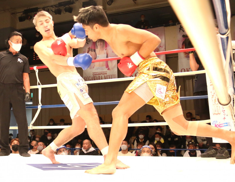 大沢(右)は里見(左)からダウンを奪い判定勝利