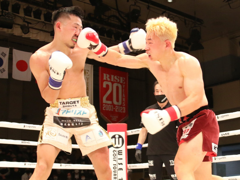 チャンヒョン(右)は常陸(左)と激しい打ち合いを展開して延長判定勝利
