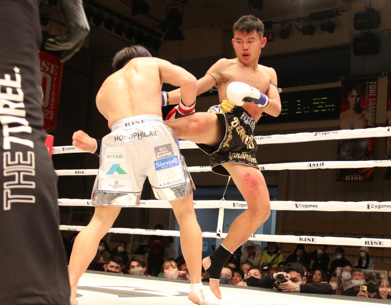 クンスックノーイはヒザ蹴りとミドルキックで田丸の左腕を狙った