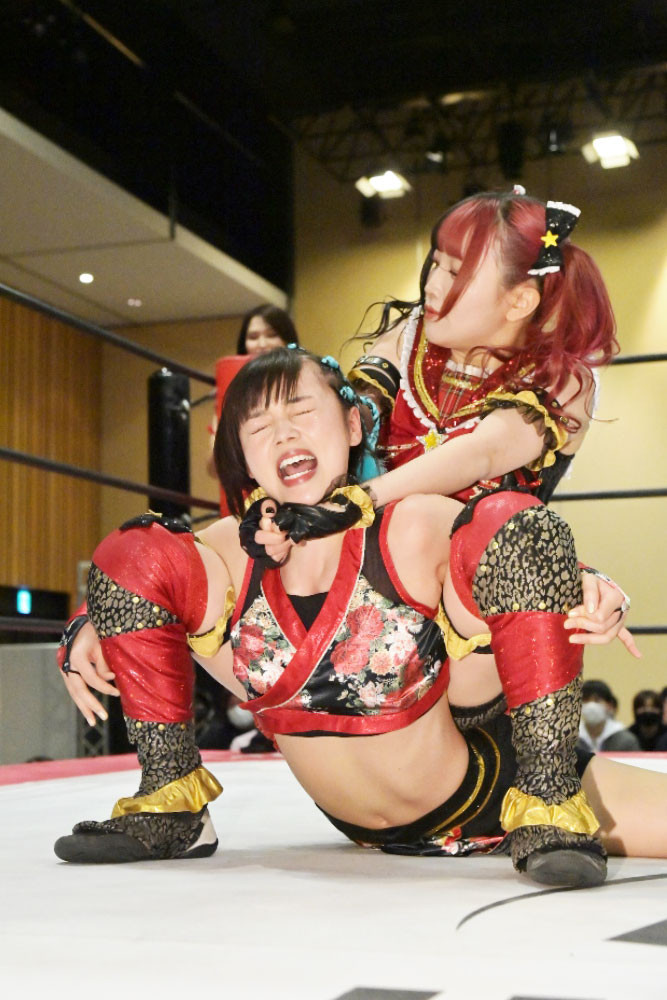 伊藤がキャメルクラッチで長野を絞め上げる