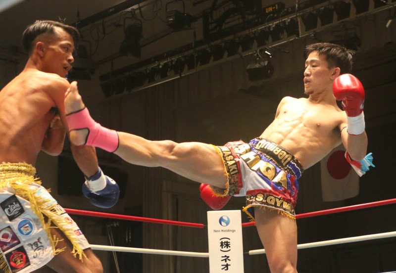 離れては蹴り、近づいては首相撲で志賀(右)が完封