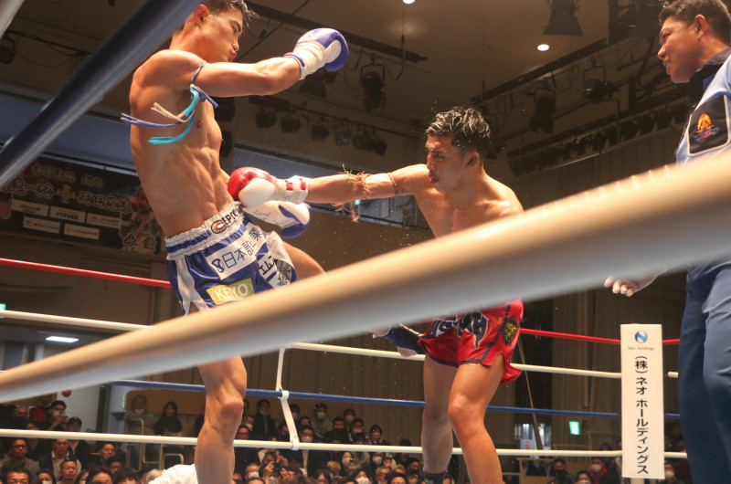 パンチのジョーム(右)に、重森がロー、ヒザを合わせる展開に