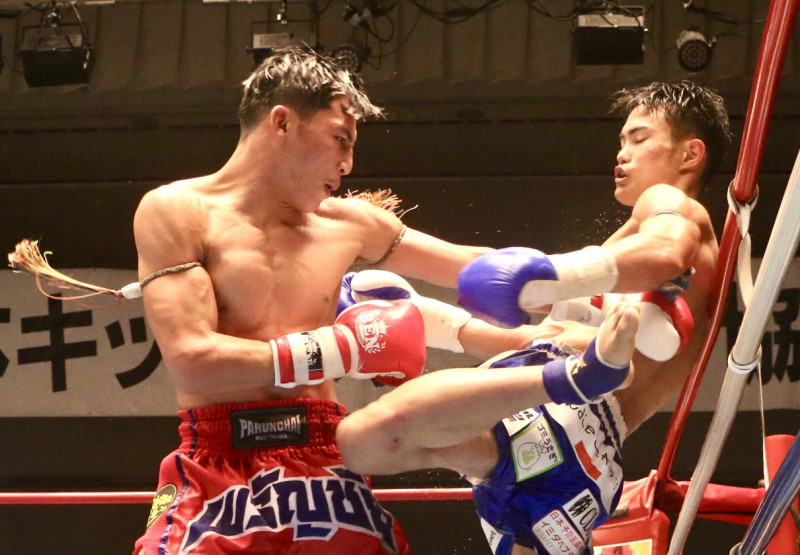 王者ジョーム(左)は強烈なボディ打ちで重森(右)の蹴りに対抗した