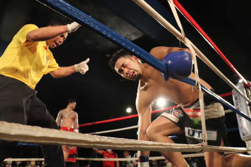 スーパーボーイ(奥)がヒジ打ちでKAZUからダウンを奪った