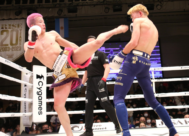 梅井はパンチと蹴りのコンビネーションで攻撃
