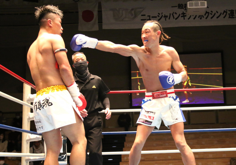 TAKUYAはパンチと蹴りのコンビネーションで攻撃