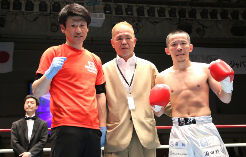 東京町田金子ジムを閉鎖する金子会長(中央)と勝利した悠斗(右)