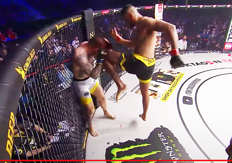怒涛のヒジ&ヒザ攻撃で壮絶な“顔面流血”KO!(OKTAGON MMA公式YouTubeより)