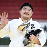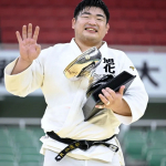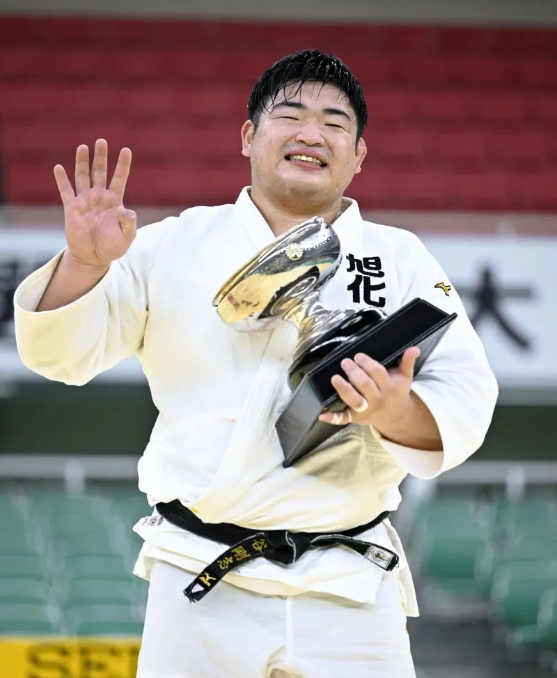 柔道の全日本選手権で6年ぶり4度目の優勝を果たし、天皇杯を手にポーズをとる王子谷剛志=29日、日本武道館