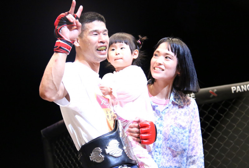 中島は今日が結婚記念日ということで、家族をリングに上げて祝福した