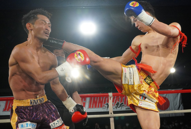 都築(左)に右ハイを見舞う前田(右)