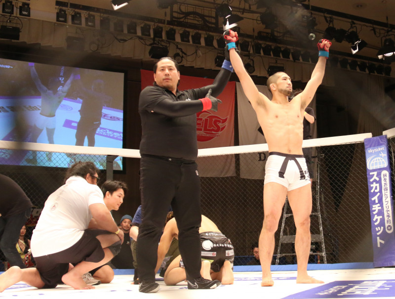 勝利した木下カラテ、黒帯はパンツのデザイン