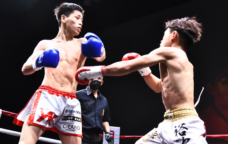 裕次郎(右)を左フックでKOした菊間優心(左)