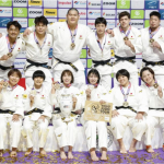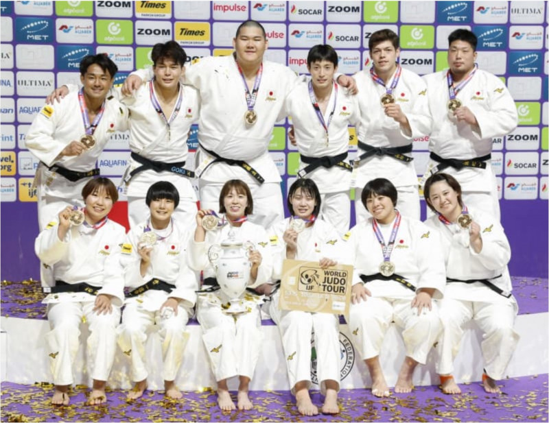 柔道の世界選手権混合団体で6連覇を果たし、金メダルを手に笑顔の日本。(後列左から)橋本壮市、田嶋剛希、斉藤立、古賀颯人、村尾三四郎、影浦心。(前列左から)桑形萌花、舟久保遥香、玉置桃、新添左季、素根輝、瀬川麻優=14日、ドーハ(共同)
