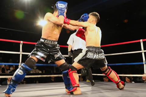 ナカザ(左)と荻原(右)の左ストレートが交錯する
