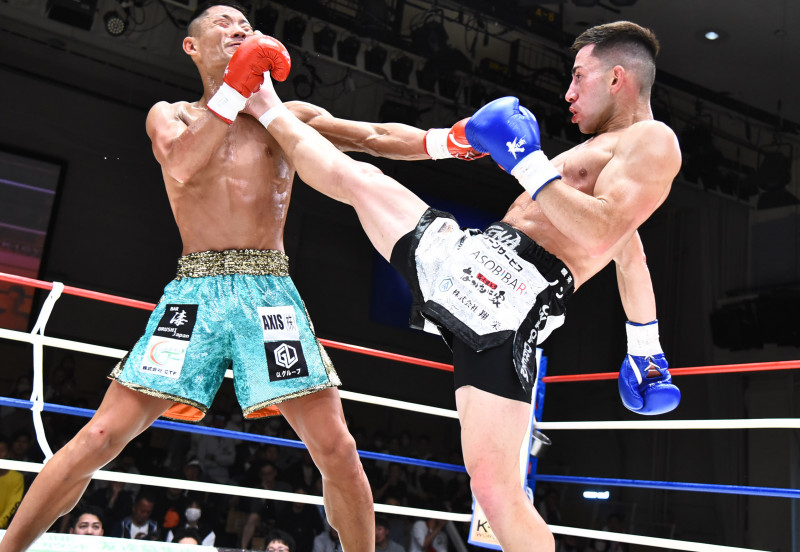 堀井(左)に顔面前蹴りをヒットさせたSEIYA(右)