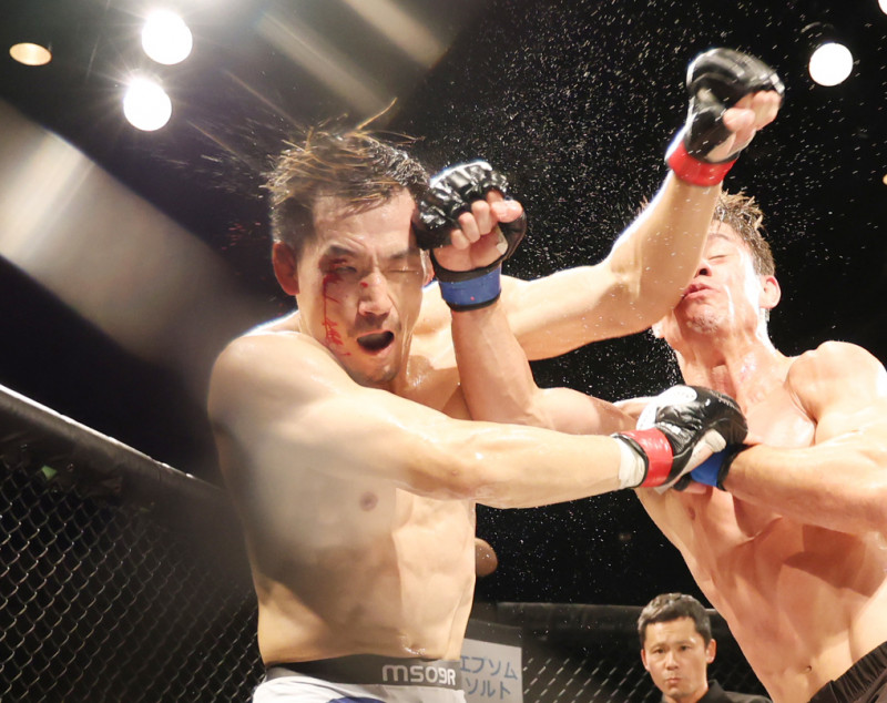 田中半蔵(左)が流血の大激闘、ロイベ(右)に競り勝った