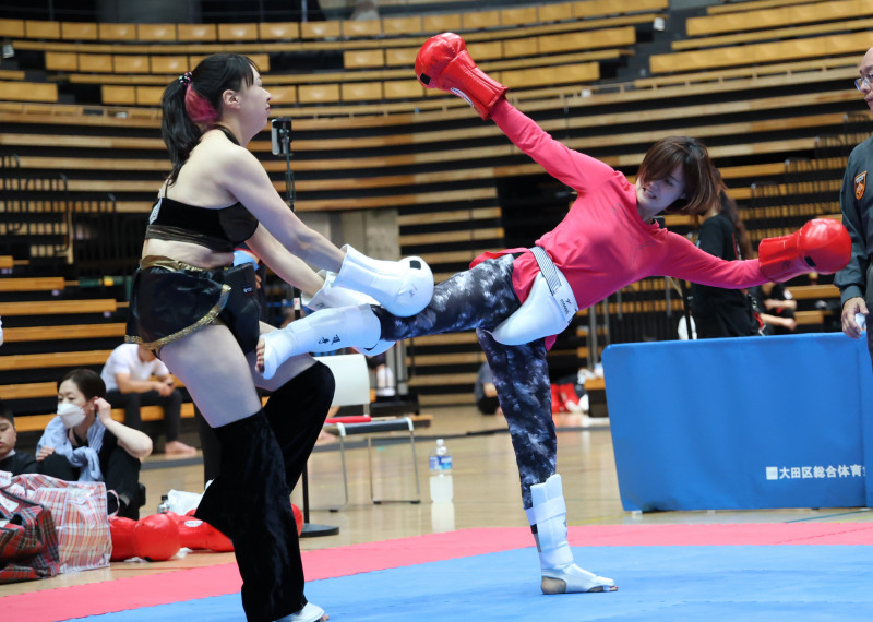 女子のエキシビションワンマッチでは柔道県大会で優勝経験のある女優のかんこ(右)が金的蹴り!女子プロレスラーのキラ・アン(左)と対戦した