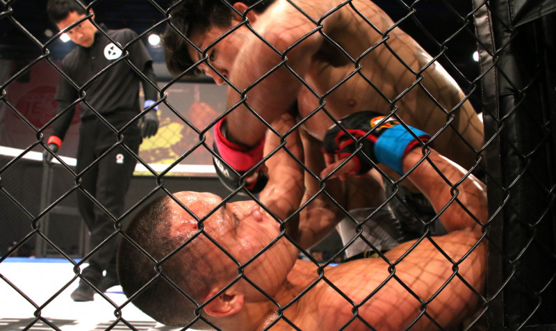テイクダウンを奪った松丸は、上から加藤にヒジを落とす