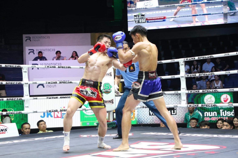 ラジャダムナンスタジアムでKO勝ちした竜哉(左)