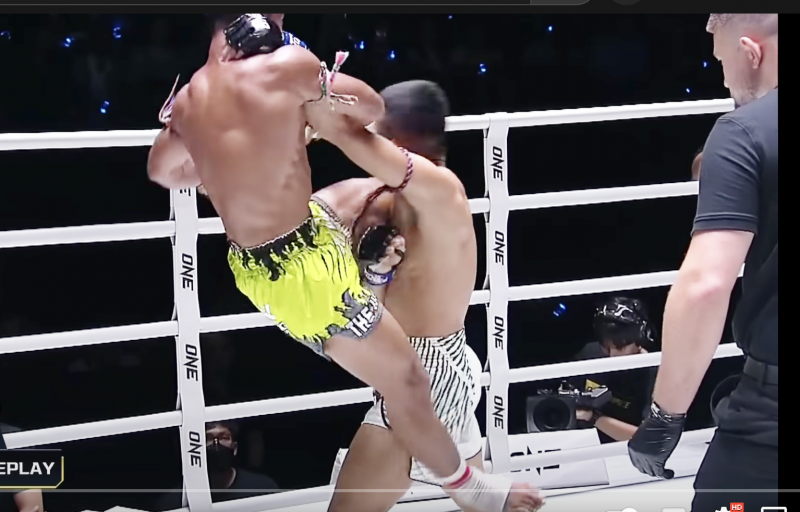この飛び蹴りの瞬間!相手のアゴを直撃