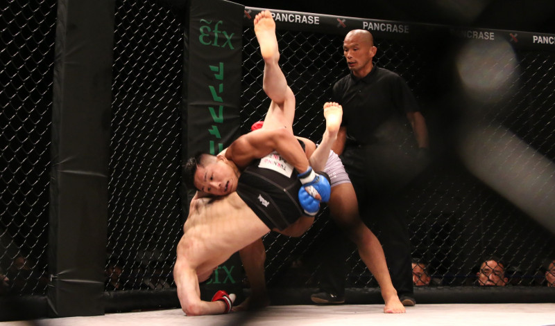 ダブルレッグから抱えて落とす平田