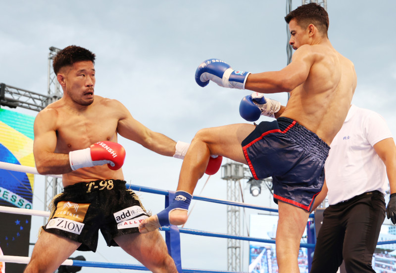 身長188cmのWMFムエタイ世界王者ヘスス(右)がT-98の技を封じ勝利した