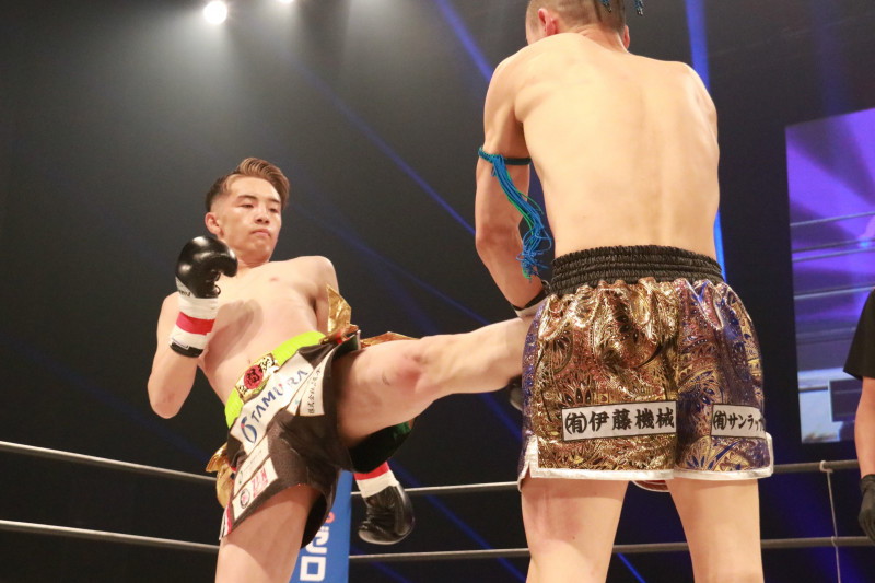 多彩な攻撃で樹を攻め立てる平松(左)