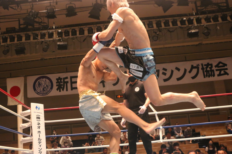 飛びヒザを繰り出す赤平