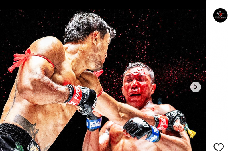 シンサムット(左)の強烈なパンチを被弾する“顔面血だるま”のテイシェイラ(右)@photoeminency