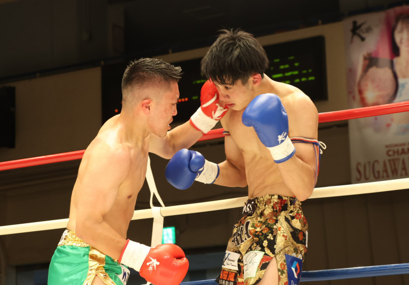 目黒翔大(左)が止まらぬ手数で勝利、KNOCK OUTファイター・新田(右)に勝利