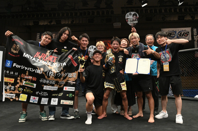 初代ストロー級王者となり、歓喜する宮澤(前列右から3番目)