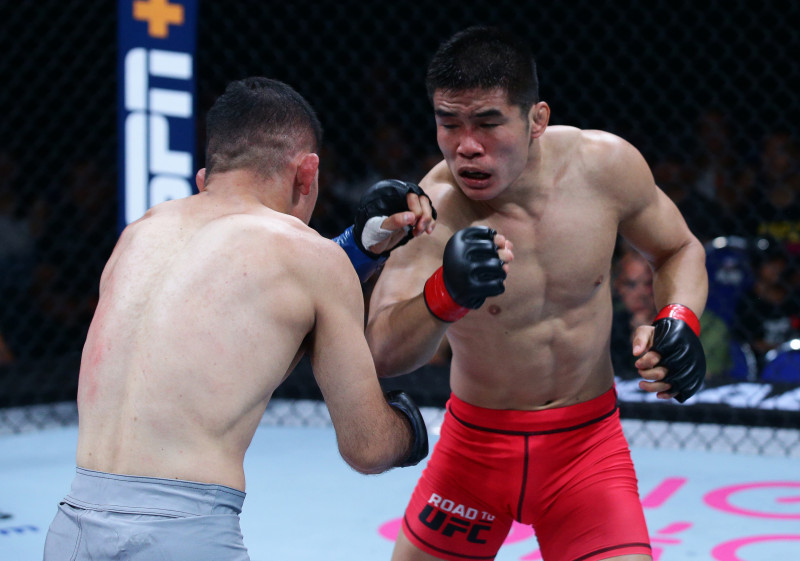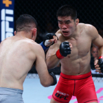 至近距離でパンチ打ち合いの上久保(左)とロン(右)©️UFC