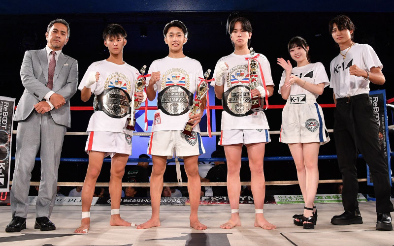 K-1甲子園の各階級優勝者と、小浜桃奈(右から2番目)、大久保琉唯(右)、Krush宮田充プロデューサー(左)(C)K-1