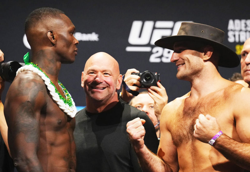 フェイスオフ、王者アデサンヤ(左)、無言のままストリックランド(右)を睨みつける©️UFC