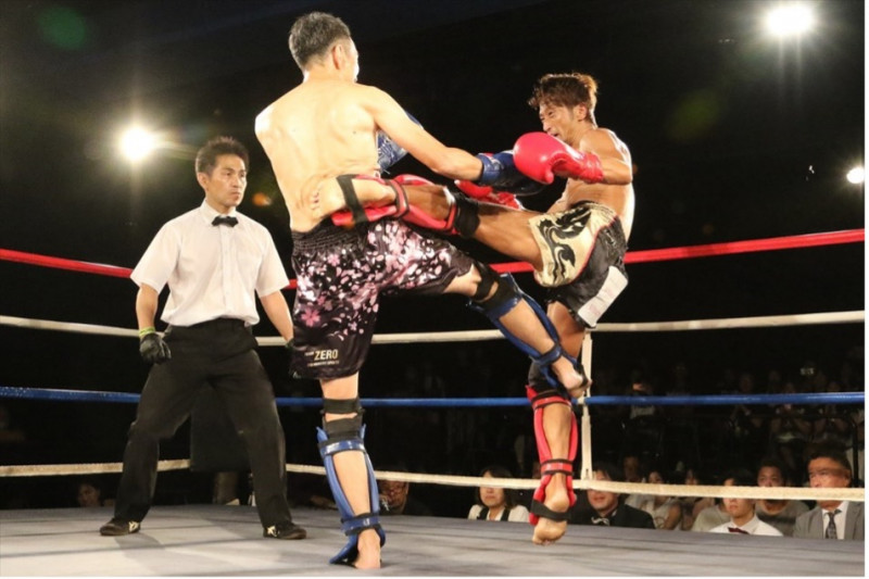大橋(右)の左ミドルと黒川(左)の右ローが交差する