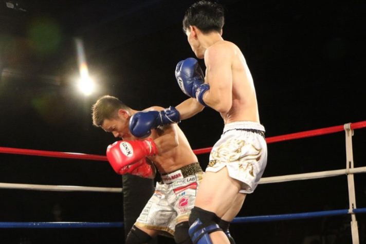 松原(右)の右ストレートが古徳(左)のアゴを捉える