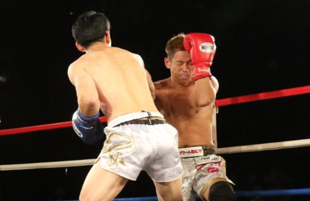 古徳(右)をロープに追い詰めラッシュする松原(左)