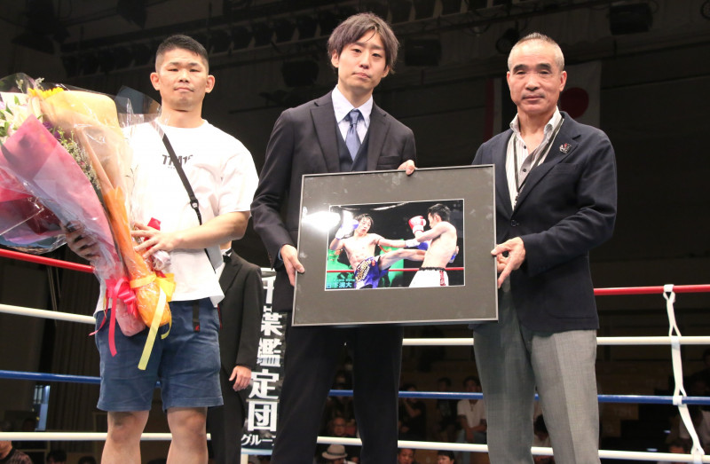元NJKFスーパーバンタム級王者・日下滉大の引退式が行われた。右は師匠の斎藤京二会長