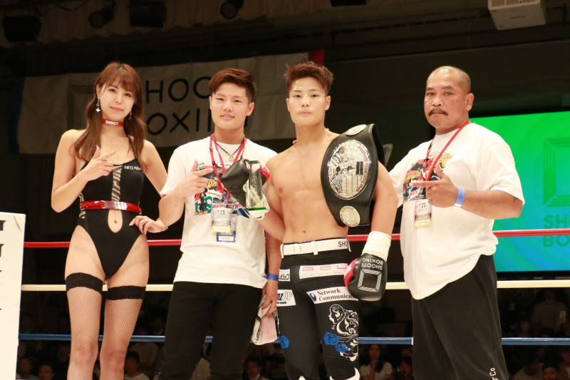 勝利した山田(右から2番目)、兄・彪太朗(左から2番目)はセコンドに付いた
