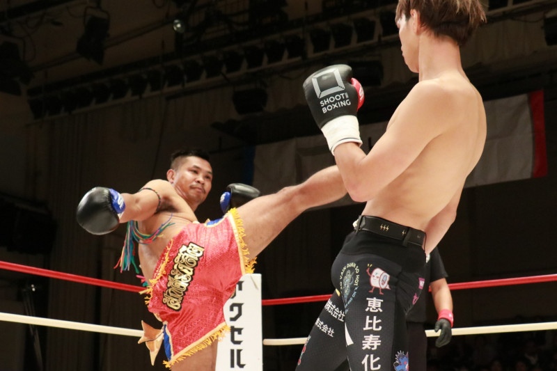 シンダムの右の蹴りを交わす笠原(右)