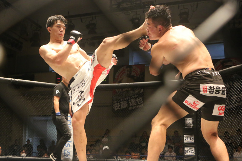 岩﨑(左)が立ちでも組みでもキム(右)を圧倒