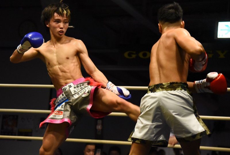 蹴り技でペースを握り、SAIGO(右)に勝利した門脇碧泉(左)