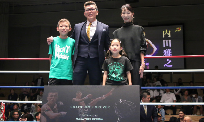 内田雅之は、19年の現役生活に幕。家族との記念撮影に応じた