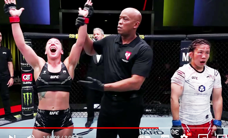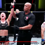 敗戦で悔しい表情の村田(右)、勝利に喜ぶデモポロス(左)(UFC JAPAN公式YouTubeより)