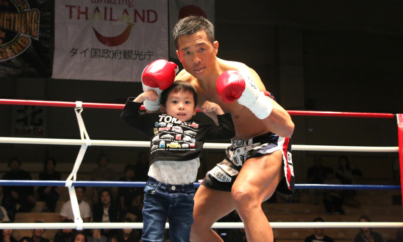 健太は112戦目をKO勝利で飾り、息子とポーズ
