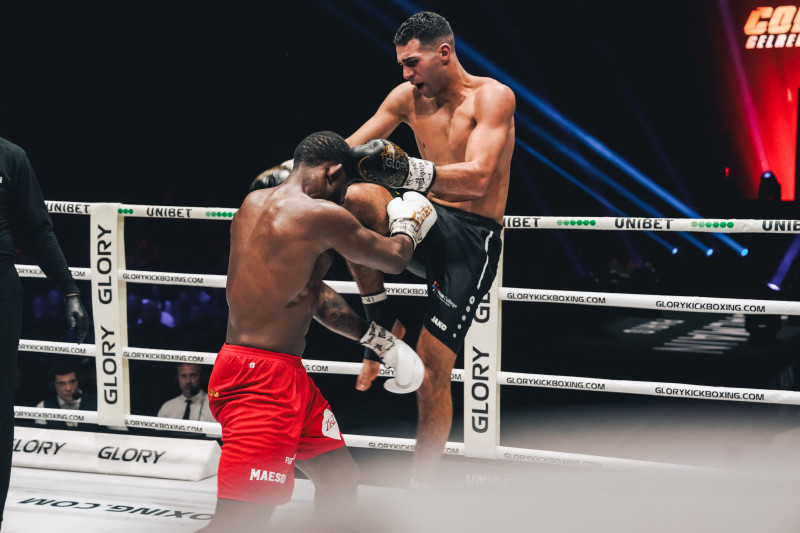 トシャッシーは最終ラウンド、逆転を狙い飛びヒザ蹴りに(c)GLORY